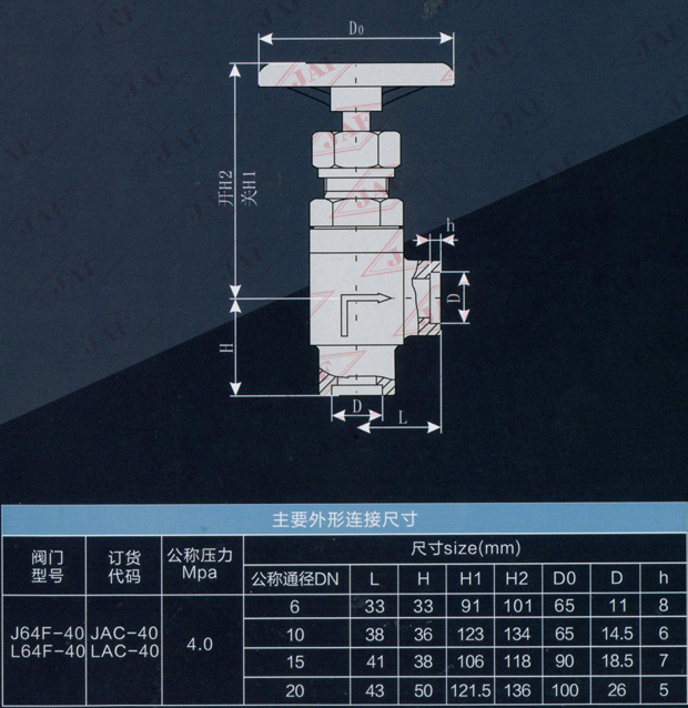 J表示截止閥 L表示節流閥 A表示結構形式為直角式 C表示插焊連接 40代表公稱(chēng)壓力為4.0MPa 40后不標注代表代表閥體材質(zhì)為鍛鋼。