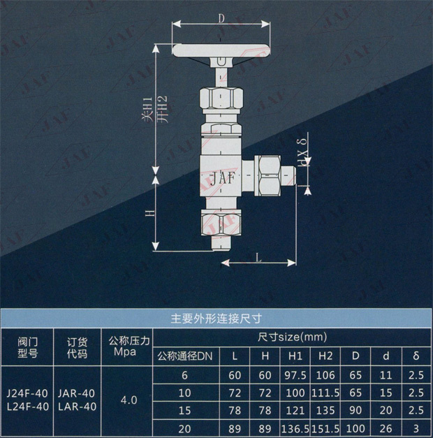 適用范圍  適用于公稱(chēng)壓力為PN4.0MPa,公稱(chēng)通徑為DN6.,DN10,DN15和Dn20進(jìn)口螺紋連接,閥體材料為鋼質(zhì)的直角截止閥和節流閥?! ¢y門(mén)屬性  公稱(chēng)壓力為PN4.0MPa,試驗壓力為PN6.0MPa,適用溫度為-50°C到+200°C,適用介質(zhì)為氨、氟等?! 表示截止閥 L表示節流閥 A表示結構形式為直角式 G表示管接頭連接 40代表公稱(chēng)壓力為4.0MPa 40后不標注代表代表閥體材質(zhì)為鍛鋼。